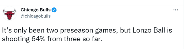 来源:JRS直播网10-11 11:40JRS直播网10月11日讯 ,芝加哥公牛更新官方社媒,晒出了球哥(朗佐-波尔)的照片,并配文写道:“刚打了两场季前赛,但朗佐-波尔的三分命中率高达64%。”