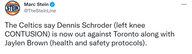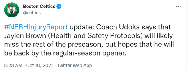 来源:JRS直播网10-10 11:27JRS直播网10月10日讯 ,NBA季前赛继续进行,凯尔特人主场迎战猛龙。赛前,名记马克-斯坦恩报道,绿军后卫丹尼斯-施罗德因左膝挫伤,缺席本场比赛,而因新冠检测阳性的杰伦-布朗目前仍在隔离中。绿军官方也更新了布朗的状况:主帅尤杜卡表示,布朗很可能无缘余下的季前赛,但他希望布朗能赶得上常规赛揭幕战。