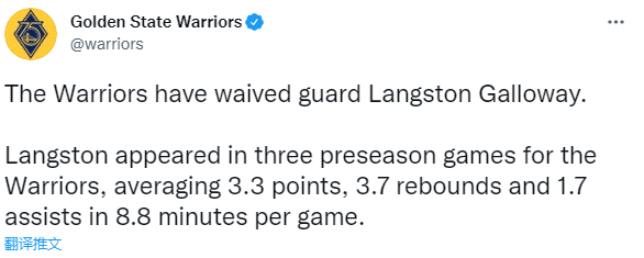 来源:JRS直播网10-10 11:16JRS直播网10月10日讯 ,勇士官方正式宣布,球队已经裁掉了后卫兰斯顿-加洛韦;季前赛出战三场,加洛韦的表现不佳,因此勇士提前宣布裁掉他。