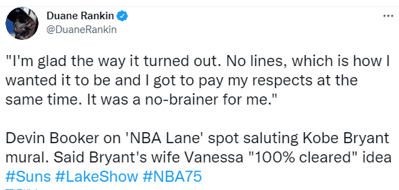 来源:JRS直播网10-10 11:13JRS直播网10月10日讯 此前NBA官方发布了75周年纪念短片《NBA小巷》,其中有一幕是布克开车停到科比壁画前,然后向其表达敬意;对此布克透露他征求到了瓦妮莎的同意。