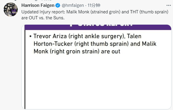 来源:JRS直播网10-10 11:11JRS直播网10月10日讯 ,洛杉矶湖人队最新伤病报告出炉,据名记Harrison Faigen报道,明天对阵太阳,除了阿里扎(右脚踝清创手术)之外,塔克和蒙克也将缺席本场比赛,塔克遭遇右手拇指扭伤,蒙克则是遭遇右腹股沟拉伤。
