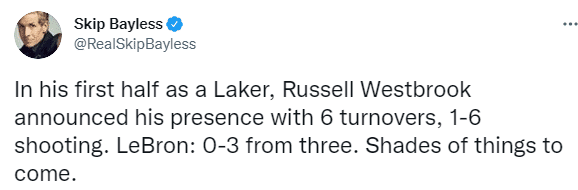 浓眉轮休不打,詹姆斯和威少季前赛首秀状态一般,仅打上半场,下半场坐在场边观战;著名詹黑斯基普-贝勒斯第一时间发推:威少上半场6投1中还出现6次失误,詹姆斯三分球3中0,湖人的未来蒙上阴影。