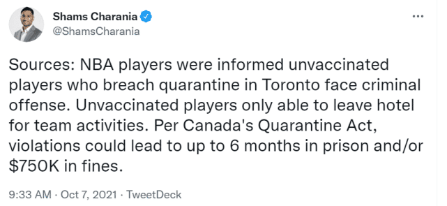 来源:JRS直播网10-07 16:58JRS直播网10月07日讯,据名记查拉尼亚报道,加拿大的防疫规定非常严格,在多伦多打球时,未接种疫苗的NBA球员只能在参加球队集体活动时,才会被允许离开酒店。如果球员违反规定,私自离开酒店,将被处于最高6个月的监禁以及75万美元的罚款。