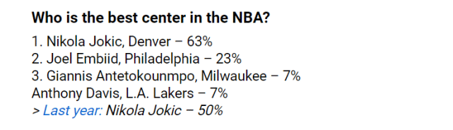 在最佳中锋的票选中,约基奇得到63%的票数,继续领跑,上赛季他得到50%的票数。位居第二的是恩比德,他得到23%票数。字母哥和浓眉并列第三,各得到7%的票数。