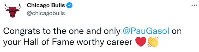 公牛官媒写道:“为唯一的加索尔的名人堂生涯送上祝贺!”