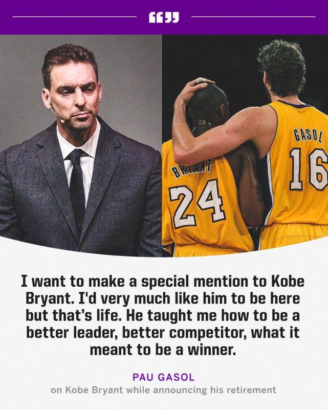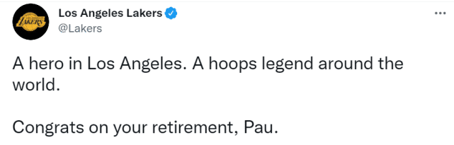 湖人官媒写道:“洛杉矶的一位英雄,世界上的一个篮球传奇,祝贺你退役了,保罗(加索尔)。”