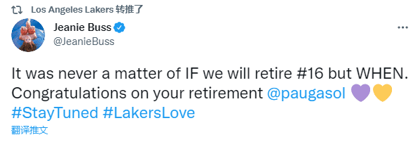 加索尔宣布退役的同时还有一个喜讯,湖人将会退役他的16号球衣,湖人老板珍妮-巴斯公开表态,发推写道:我们是否退役加索尔的16号球衣从来不是一个问题,而是何时退役,恭喜加索尔退役;之后湖人官方转发老板的言论。