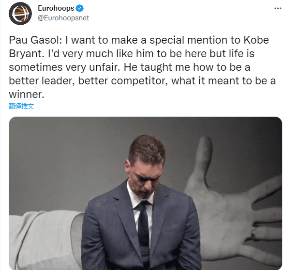 在发布会现场,41岁加索尔提到科比时哽咽流泪,他表示:我想特别提到科比-布莱恩特。我非常希望他能在这里,但生活有时就是很不公平。他(科比)教我如何成为一个更好的领导者、更好的竞争对手以及如何成为一个赢家。