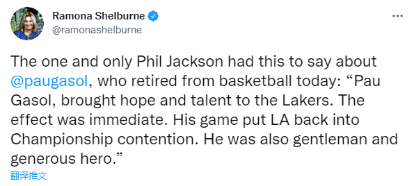 NBA传奇教头菲尔-杰克逊盛赞加索尔:保罗-加索尔为湖人队带来了希望和天赋。效果立竿见影。他的比赛让湖人队重新进入冠军争夺战。他也是一位绅士和慷慨的英雄。