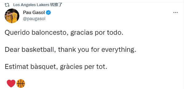 正式宣布退役之后,加索尔在社交媒体上晒照,并且用多钟语言表示:亲爱的篮球,谢谢你所做的一切。