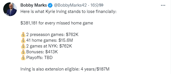 薪资专家Bobby Marks列出了欧文将面临的经济损失详情——每缺席一场主场赛损失38万1181美元;2场季前赛损失76.2万美元;41场主场常规赛总共损失1560万美元;2场对阵尼克斯比赛损失76.2万美元;奖金41.3万美元;同时,Marks也表示欧文有资格签下4年1.87亿美元的续约合同。