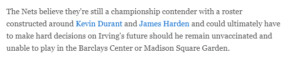 之后沃纳罗斯基跟进报道,篮网相信杜兰特和哈登仍旧能带队夺冠,如果欧文没有接种疫苗,不能在巴克莱中心或麦迪逊广场花园打比赛,他们最终可能不得不对欧文的未来做出艰难的决定。