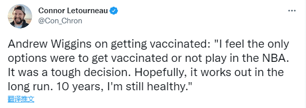 勇士和开拓者赛后,维金斯回应自己最终接种疫苗,他表示:这是一个艰难的决定,因为我要么接种疫苗、要么就不能打NBA了。