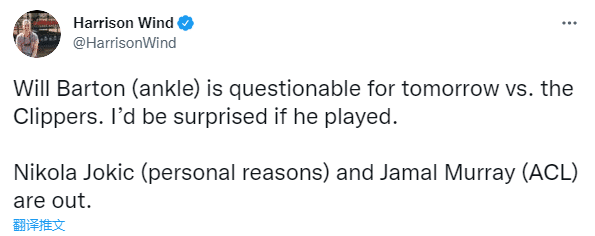 快船队6人缺阵,丹佛掘金则是至少两大主力不打,掘金记者Harrison Wind报道,约基奇(个人原因)和穆雷(十字韧带伤势)都确定缺席,巴顿因脚踝伤势被列为出战成疑,该记者表示若巴顿出战,他会感到十分惊讶,言外之意就是巴顿大概率会不打。