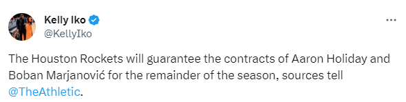 火箭随队记者Kelly Iko报道,火箭将全额保障阿隆-霍勒迪和博班本赛季的合同;去年夏天,阿隆-霍勒迪和博班都是与火箭签下为期一年的老将底薪,前者的年薪为235万美元,后者是289万美元。