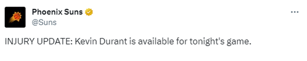 由于遭遇腿筋伤势,杜兰特因伤连续缺席了3场比赛,连续缺战开拓者、快船和热火,期间布克和比尔带队2胜1负;今日主场对阵灰熊,杜兰特的出战状态从成疑到赛前决定,最终确定复出,太阳三巨头再次合体