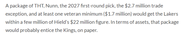 如上文所述,美媒认为湖人有可能换来的球员包括希尔德和安德森。希尔德的投射能力很强,他可以让湖人的外线进攻更犀利。美媒认为湖人用霍顿-塔克、纳恩、2027年的首轮签和270万的交易特例以及至少一个老将底薪球员,可以配平希尔德2200万的工资。纸面上看,国王会满意这样的5换1报价。