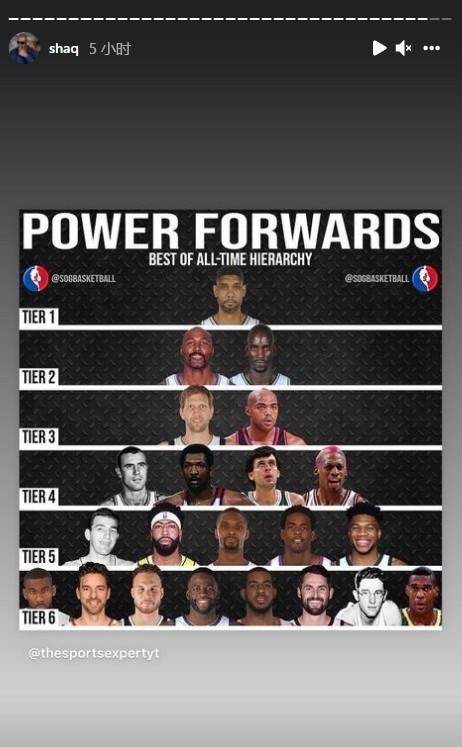 奥尼尔转发NBA历史上大前锋金字塔:司机不及加内特,邓肯独一档