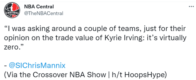 来源:JRS直播网09-30 11:10JRS直播网9月30日讯 ,据《体育画报》记者Chris Mannix的报道,凯里-欧文的交易价值基本是零。“我问了几支球队,就是看看他们认为欧文的交易价值有多少:基本上是零。他的新赛季薪水3500万美元,并且他非常难以捉摸。”