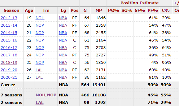 数据上来看,浓眉生涯其实有50%的时间打中锋。效力鹈鹕的7个赛季,45%的时间打大前锋,55%的时间打中锋。效力湖人的2个赛季,71%的时间打大前锋,29%的时间打中锋。浓眉打中锋比例最高的一个赛季,是2018-19赛季,效力鹈鹕的最后一年,96%的时间打中锋。浓眉打中锋比例最低的一个赛季,是2020-21赛季,也就是上赛季,只有10%的时间打中锋。