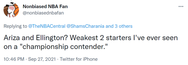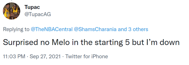 三巨头首发没悬念,球迷有争议的是另外两个位置的人选。按照查拉尼亚的报道,湖人在侧翼安排的球员是阿里扎和埃灵顿。不少球迷认为让这两位球员首发,不如让安东尼首发。一个球迷写道:“阿里扎和埃灵顿?这是我在一支总冠军竞争者球队里看到最弱的两个首发球员。”另一个球迷写道:“惊讶于甜瓜没在首发中。”