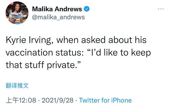 欧文在线上进行了媒体日的采访,最令人关注的话题依旧是接种疫苗,欧文直言这是自己的隐私,内容是:“我希望把这控制在个人隐私范围,首先我是个人。就是以正确的方式应对,和球队一起计划未来,团队优先。没错,今天我不能去媒体日的现场,但这不代表我未来会受什么限制。这是我的个人隐私,今天我不会再回答相关问题。”