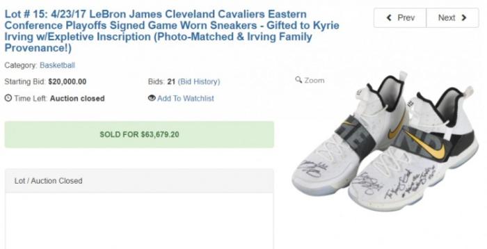 其实这双鞋子在拍卖网站上挂很久了,在拍卖完成前一天,最高竞价也只有2.8万美元,但最后一天被炒到6.37万美元,这也是老詹对于欧文的一番期待,算是两人友谊的象征。得知欧文故意拍卖掉詹14战靴,昔日队友特里斯坦汤普森说了这么一句话:“不管出于什么目的,我都不能理解他的行为。别人赠送的礼物一定要好好保存,我不得不说,我为勒布朗感到难过,也为凯里欧文感到羞耻!”