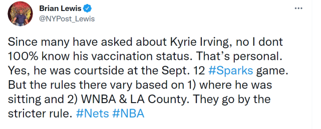 关于欧文是否接种疫苗这件事,其实尚未有定论。福布斯记者Yaron Weitzman表示,欧文还没接种新冠疫苗,但篮网记者Brian Lewis表示,欧文在当地时间9月12日去观看了一场WNBA比赛,而他所坐的位置有严格的规定,必须是完全接种疫苗的人才能坐在那儿。