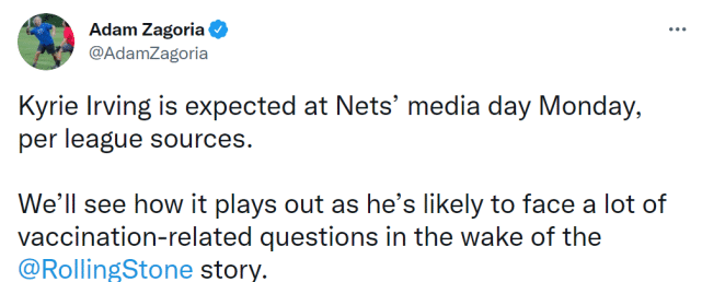 来源:JRS直播网09-27 11:04JRS直播网9月27日讯 ,据NBA记者Adam Zagoria报道,消息人士透露,篮网球星欧文预计参加明天的媒体日。此前,欧文的姑姑Tyki曾表示,她认为欧文会在媒体日上和记者们谈谈疫苗的话题。
