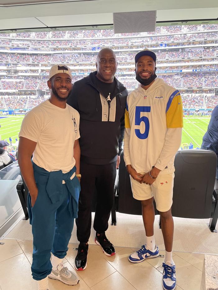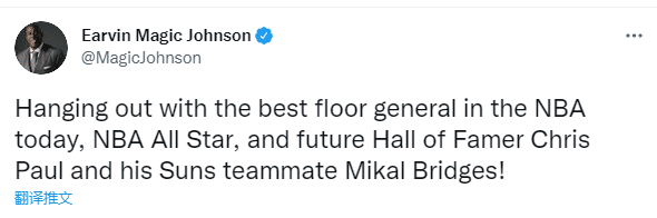 湖人名宿魔术师晒出自己与保罗、布里奇斯的合影,配文:和NBA场上最好额场上指挥官、NBA全明星也是未来名人堂克里斯-保罗还有他的队友布里奇斯一起看比赛。