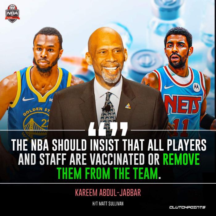 目前联盟大概有90%的球员已经接种疫苗,欧文、维金斯、艾萨克等人拒绝接种疫苗引热议,针对这种行为,NBA名宿贾巴尔表示联盟该把拒绝接种的球员从他们的球队中除名。
