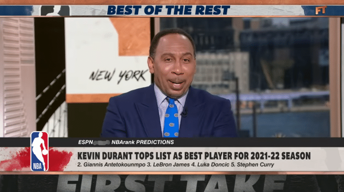 来源:JRS直播网09-26 15:04JRS直播网9月26日讯 ,权威体育媒体ESPN此前评选了新赛季百大球员,其中篮网巨星杜兰特力压上赛季FMVP字母哥排在第一。而近日,ESPN王牌评论员斯蒂芬A史密斯在节目中谈到了杜兰特与字母哥。