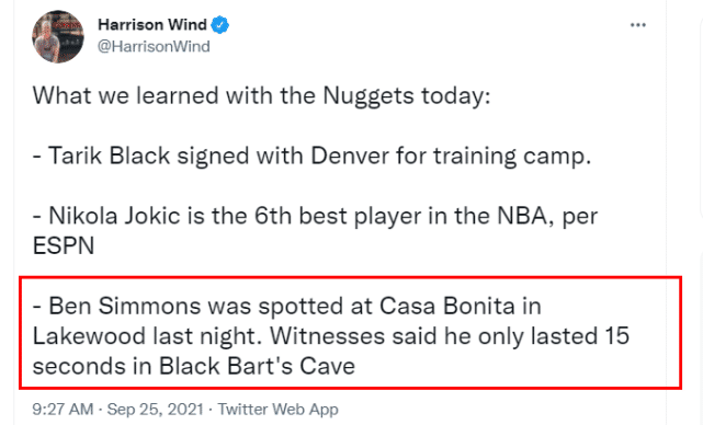 来源:JRS直播网09-25 14:40JRS直播网9月25日讯 ,据掘金记者Harrion Wind报道,有人昨晚在丹佛的莱克伍德Casa Bonita餐厅偶遇本-西蒙斯,他短暂停留后离开。此前,美媒报道称掘金有兴趣得到西蒙斯,如今,西蒙斯现身丹佛引人遐想。