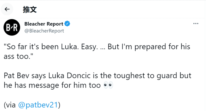 来源:JRS直播网09-25 10:12JRS直播网9月25日讯,森林狼球员贝弗利今天接受了线上采访,当被问到谁是NBA现役最难防守的球员时,贝弗利回答:东契奇,他是目前最难防守的,这是一个很容易的问题,不过我也准备好在新赛季踢他的屁股了。