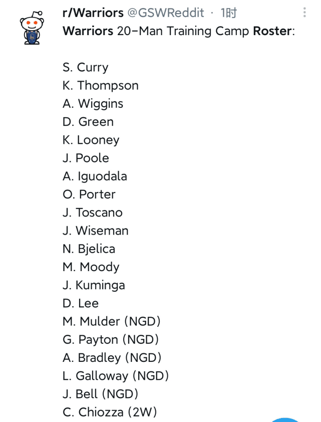 随着这3名球员的正式签约,勇士20人训练营名单已经出炉,具体球员如下:库里、汤普森、维金斯、格林、卢尼、普尔、伊戈达拉、波特、托斯卡诺-安德森、怀斯曼、别利察、穆迪、库明加、达米恩-李、穆尔德(非保障)、佩顿(非保障)、布拉德利(非保障)、加洛维(非保障)、贝尔(非保障)、齐奥扎(双向)。