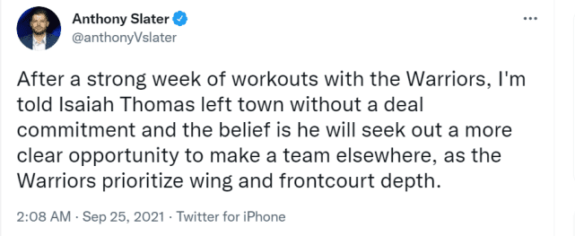 小托马斯已经主动退出勇士最后一席的竞争。勇士记者安东尼-斯雷特报道称,“在勇士进行了一周表现强劲的试训之后,我被告知小托马斯在没有得到签约承诺的情况下离开了。他相信自己会在其他球队得到更明确的机会,因为勇士优先考虑的是侧翼和前场深度。”