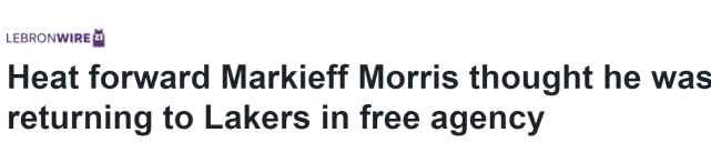 大莫里斯在湖人效力了一年多,累计出战75场比赛,场均6.4分4.1篮板1.1助攻,投篮命中率40.5%,三分命中率31.5%。休赛期,他和热火签下一年合同,新赛季将帮助热火冲击总冠军。