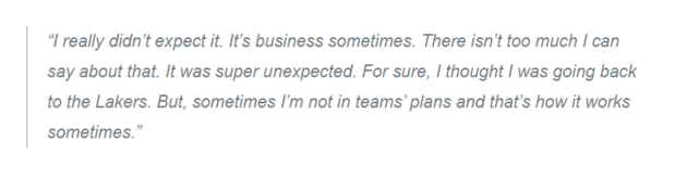否认归否认,但大莫里斯也透露自己原以为可以留在湖人继续效力。“我真的没预料到(会离开湖人),有时候就是生意。关于这件事,我没太多可以说的。我原以为自己会回到湖人,但我并不在球队的计划中,有时候就是这样。”