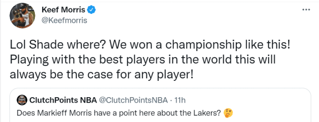 显然,美媒的这番言论,让大莫里斯很不爽。他转发了这张图,并配文回怼道:“哪里在暗讽?我们就是像这样(团队协作)赢得一次总冠军!在世界上最好的球员们身边打球,对于任何球员来说,都是如此。”