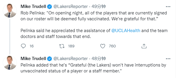 截止到目前,湖人全队都已接种疫苗,此前佩林卡表示:在新赛季揭幕式之前,我们队内的所有球员都将接种疫苗,我对此表示感谢,感激湖人球员不会因为未接种疫苗而受到干扰。