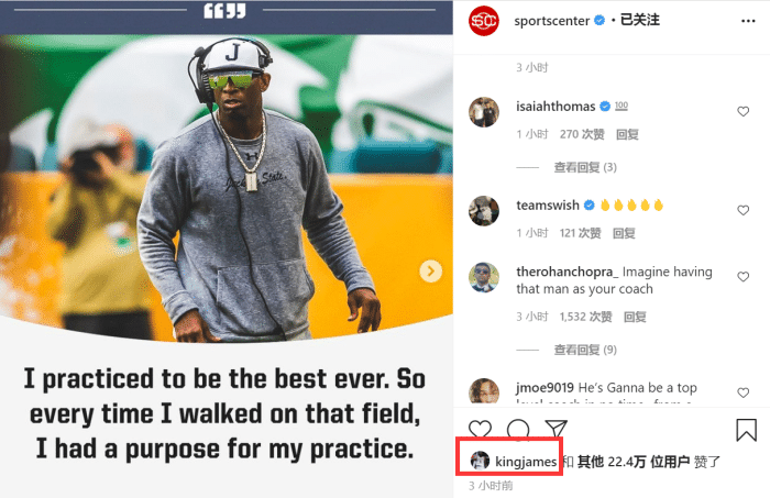 来源:JRS直播网09-21 16:10JRS直播网9月21日讯 ,湖人巨星詹姆斯前不久更新社交平台,点赞并转发了NFL名人堂球员迪昂桑德斯的采访言论:我训练是为了成为历史最佳球员,所以每当我走上那块球场,我都是带有目的去完成训练。