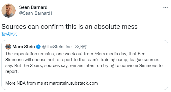来源:JRS直播网09-21 09:50JRS直播网9月21日讯 ,76人和西蒙斯的最新情况曝光,据名记Marc Stein报道,西蒙斯仍旧坚持不去球队报到,不过76人依旧打算说服西蒙斯来球队报到;对此另一记者SeanBarnard表示:消息来源可以确认,现在的情况是一团糟。