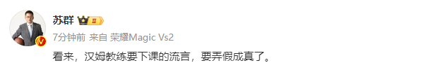 国内名嘴苏群更新动态,写道:看来,哈姆教练要下课的流言,要弄假成真了。