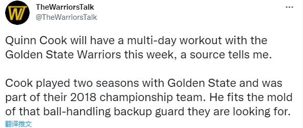 来源:JRS直播网09-19 10:56JRS直播网9月19日讯 ,据美媒体The WarriorTalk报道,奎因-库克将在本周和勇士队一起训练多日,库克曾为金州勇士队效力了两个赛季,是勇士2018年冠军球队的一员;该美媒还表示:库克符合勇士正在寻找的控球后卫。