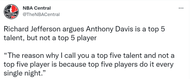 杰弗森说道:“没有人会把他(浓眉)称为联盟前五的球员,但他们会说他拥有前五的天赋。这是最不尊重人的说法之一,但我之所以说他具有前五的天赋,却不是前五的球员,是因为联盟前五的球员每个晚上都能有很好的表现。”