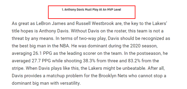 当然,浓眉似乎一直不关心外界的声音。这位8届全明星在场外很低调,休赛期,甚至没人找得到他。可是当他再次现身时,大家发现浓眉的身材保持很好,甚至还瘦了一些,看来他没有荒废训练。2020-21赛季,浓眉场均21.8分7.9篮板3.1助攻,投篮命中率49.1%,当他健康时,他还是一个很有统治力的球员。美媒Fadeaway World在评估新赛季湖人冲冠的要素时,第一要素就是浓眉必须打出MVP级别的水准。