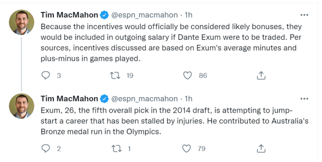 26岁的埃克萨姆,是2014年选秀大会的5号秀,生涯至今饱受伤病困扰。东京奥运会上,他帮助澳大利亚男篮拿到了铜牌。火箭设计这样的合同,也是为了规避风险,毕竟,埃克萨姆此前赛季缺席太多比赛。