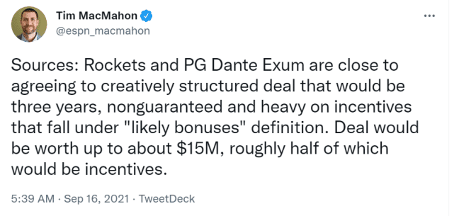 来源:JRS直播网09-16 11:05JRS直播网9月16日讯 ,据名记Tim MacMahon报道,消息人士透露,火箭与埃克萨姆接近达成一份3年1500万美元的无保障合同。这份合同很特别,三年无保障,总金额近一半为非常可能得到的奖金,因此,当埃克萨姆被交易时,奖金可以被计入工资。这些奖金将主要基于他的平均上场时间及比赛正负值。