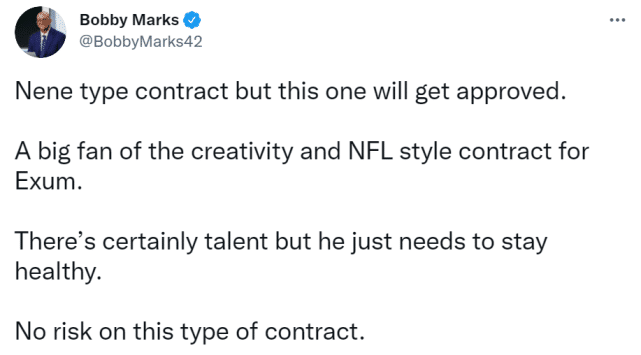 薪金专家鲍比-马克斯点评了这份合同:“内内式的合同,只不过这一份将被通过。对于埃克萨姆来说,这是一份NFL风格的创新式合同。他是有天赋的球员,但他需要保持健康。(对火箭来说)这类合同是毫无风险的。”