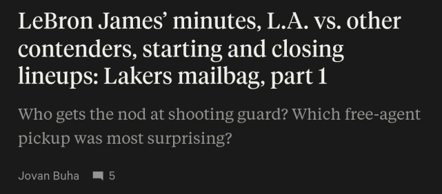 来源:JRS直播网09-15 14:42JRS直播网9月15日讯 ,湖人跟队记者Jovan Buha撰文回答了球迷的多个问题,解析了目前球队的五大悬念。湖人现有的实力能排联盟第几?新赛季詹姆斯场均会打多长时间?湖人的首发和轮换是怎样的?Buha都给出了他的答案——
